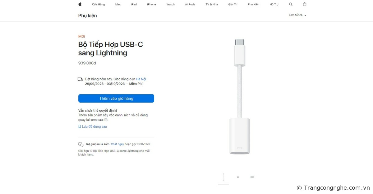 Sau khi tích hợp cổng USB-C trên tất cả bốn phiên bản của dòng iPhone 15 series, trên trang chủ Apple Store, Apple đã tung ra thị trường bộ chuyển đổi từ cổng Lightning cũ sang USB-C với mức giá 939.000 đồng.