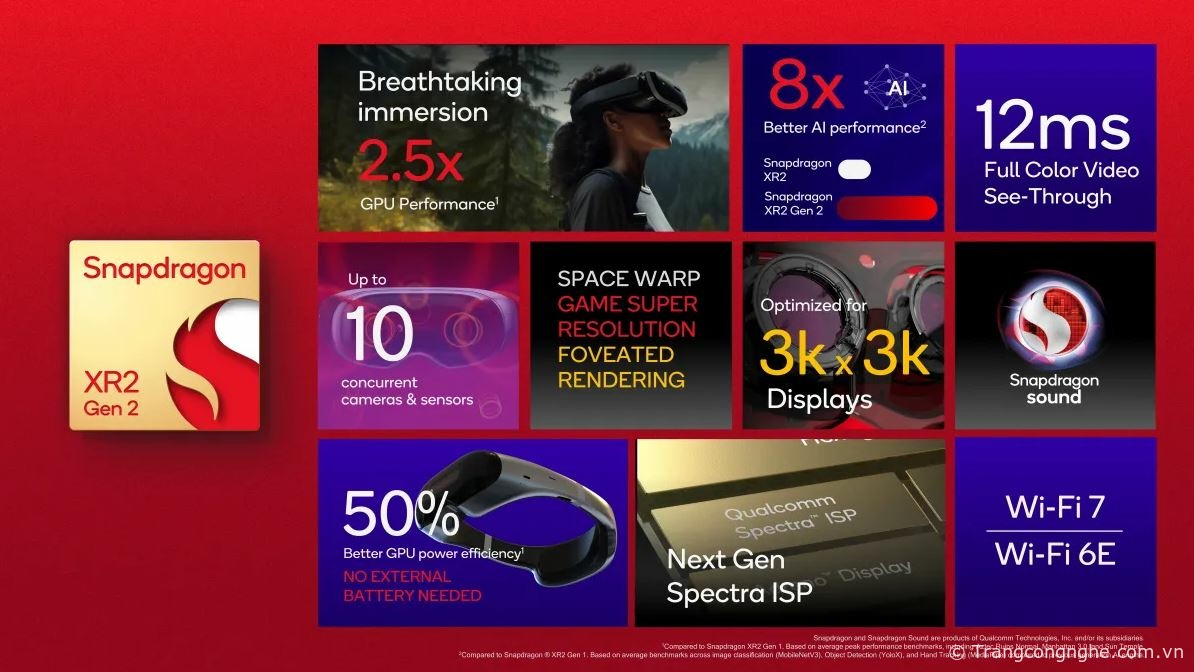 Qualcomm khẳng định, XR2 Gen 2 có thể được sử dụng để tạo ra những chiếc tai nghe mỏng hơn và tiện dụng hơn bằng cách tập hợp tất cả các tính năng mà phần cứng đó cần vào một "kiến trúc chip đơn”. Con chip này sẽ xây dựng dựa trên GPU được đánh giá có hiệu suất gấp 2,5 lần so với phiên bản tiền nhiệm; trang bị Wifi 6E và Wifi 7; Spectra ISP và hỗ trợ Snapdragon Sound.
