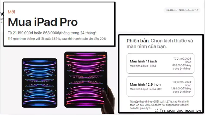 Apple kết hợp với Mono hỗ trợ khách hàng khi mua có thể trả góp theo chính sách. Phí chuyển đổi trả góp sẽ được tính dựa trên kỳ hạn trả góp và số tiền được giải ngân, cụ thể như sau: Trả góp 6, 12, 18, 24 tháng cho iPhone, iPad, Mac và Apple Watch mua trên Apple Store trực tuyến: 1,67%/tháng. Ngoài ra, học sinh, sinh viên có thể mua máy Mac hoặc iPad với mức giá đặc biệt và được giảm giá khi mua phụ kiện và chương trình AppleCare+.