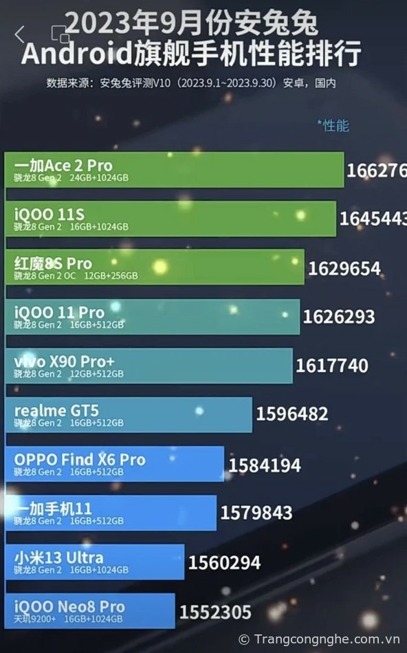Theo danh sách, nằm ở vị trí thứ hai là iQOO 11S với số điểm là 1.645.443 điểm. Những cái khác là RedMagic 8S Pro, iQOO 11 Pro, Vivo X90 Pro Plus, Oppo Find X6 Pro, OnePlus 11, Xiaomi 13 Ultra và iQOO Neo8 Pro.