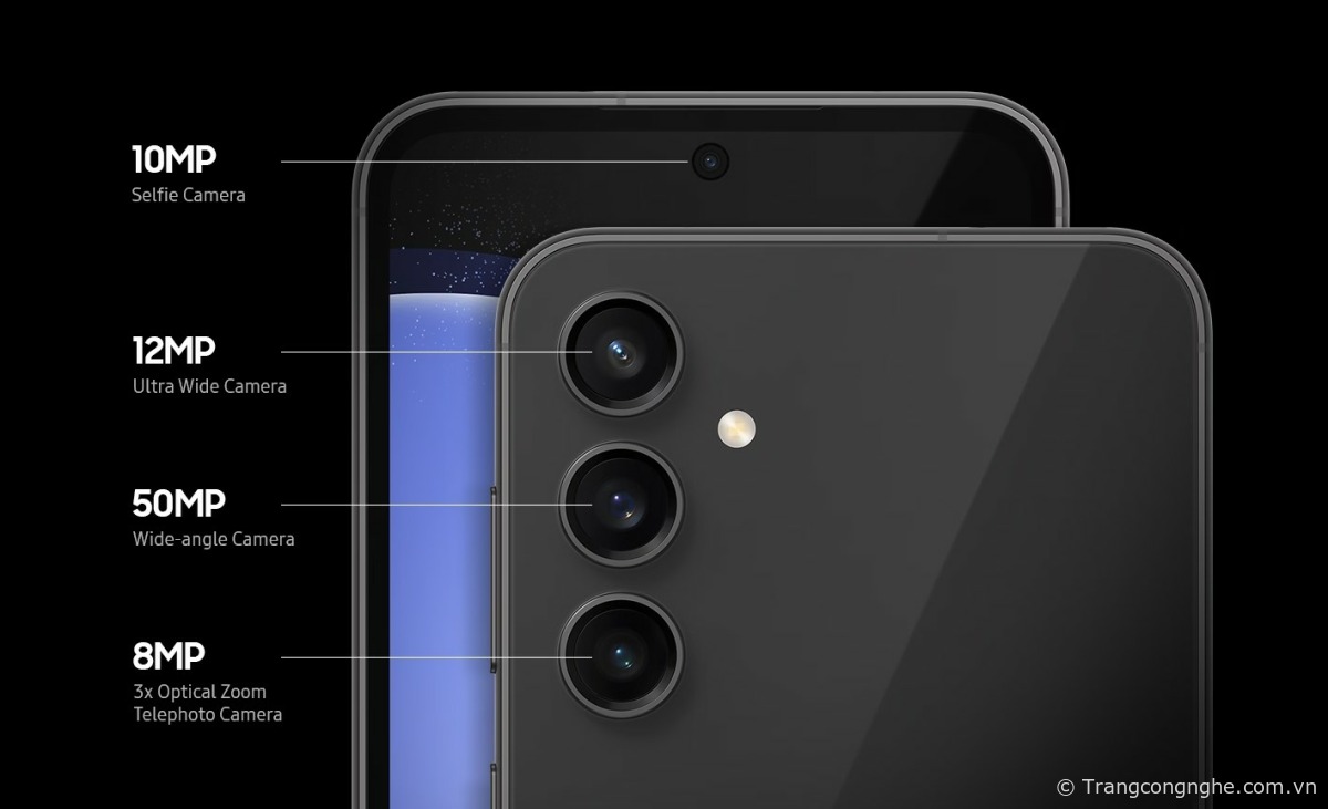 Một nâng cấp quan trọng trên Galaxy S23 FE nằm ở cụm camera chính của máy, với cảm biến chính 50MP, tăng từ 12MP của thế hệ trước. Tuy nhiên, nó chỉ được trang bị camera góc siêu rộng 10MP 123 độ và camera tele 8MP zoom 3x. Ngoài ra, camera selfie ở mặt trước chỉ có độ phân giải 10MP.