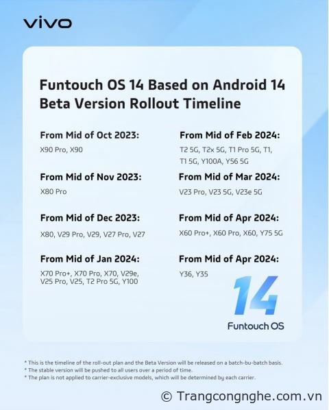 vivo đã chính thức ra mắt Funtouch OS 14 và công bố danh sách điện thoại thông minh vivo và iQOO đủ điều kiện để nâng cấp tại Ấn Độ cùng với lịch trình ra mắt phiên bản beta. Trước đó, vivo đã phát hành bản Android 14 beta cho vivo X90 Pro vào tháng 5 và công bố Chương trình Funtouch OS 14 Preview dựa trên Android 14 vào tháng 9.