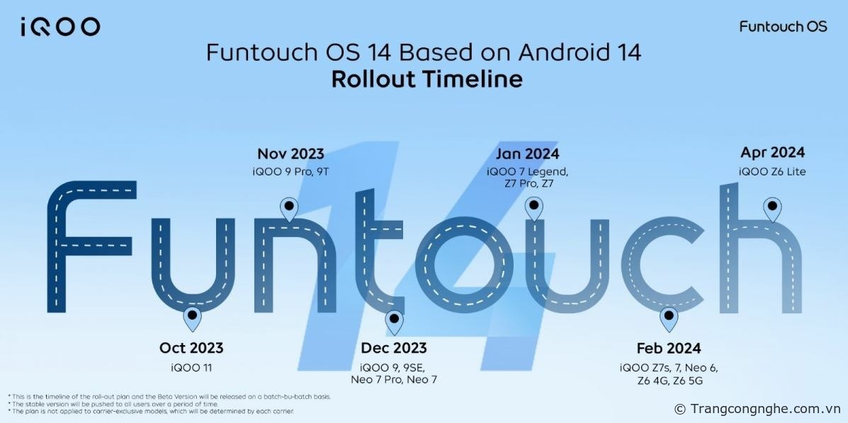 iQOO cũng chia sẻ lịch trình phát hành Funtouch OS 14 beta tại Ấn Độ. Khoảng hơn 10 mẫu điện thoại thông minh mang thương hiệu này đủ điều kiện để nâng cấp, trong đó iQOO 11 là thiết bị đầu tiên được trải nghiệm Funtouch OS 14. Bản cập nhật sẽ được phát hành hôm nay, vì vậy người dùng iQOO quan tâm có thể đăng ký chương trình beta sau hôm nay. Tuy nhiên, iQOO cho biết các mẫu Z5 trở lên sẽ không phát hành Funtouch OS 14.