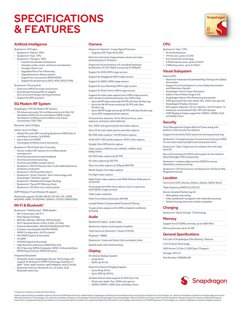 Trước đó, hàng loạt thương hiệu như ASUS, HONOR, IQOO, Meizu, NIO, Nubia, OnePlus, OPPO, Realme, Redmi, REDMAGIC, Sony, vivo, Xiaomi và ZTE đều đã xác nhận rằng họ sẽ ra mắt điện thoại sử dụng Snapdragon 8 Gen 3.