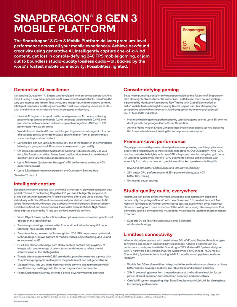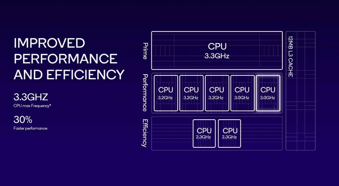 Qualcomm cũng cung cấp một số tốc độ xung nhịp cao, với lõi lớn có tốc độ 3,3 GHz, ba trong số các lõi trung bình có tốc độ 3,2 GHz, hai lõi trung bình còn lại chạy ở tốc độ 3 GHz và hai lõi nhỏ có tốc độ 2,3 GHz. Con chip này cũng được trang bị bộ nhớ đệm L3 12 MB, tăng so với 8 MB lần trước.