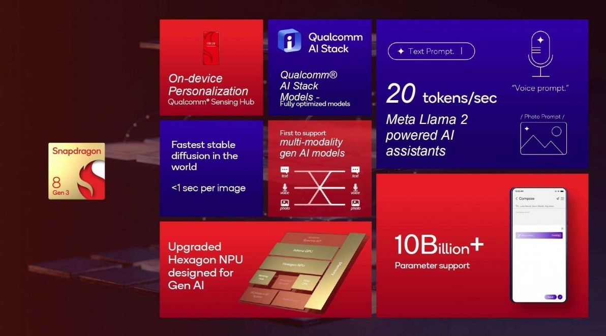Snapdragon 8 Gen 3 sẽ hỗ trợ các mô hình AI đa phương thức, theo đó người dùng có thể nhập văn bản, hình ảnh và giọng nói và yêu cầu AI xuất ra văn bản, hình ảnh và giọng nói.