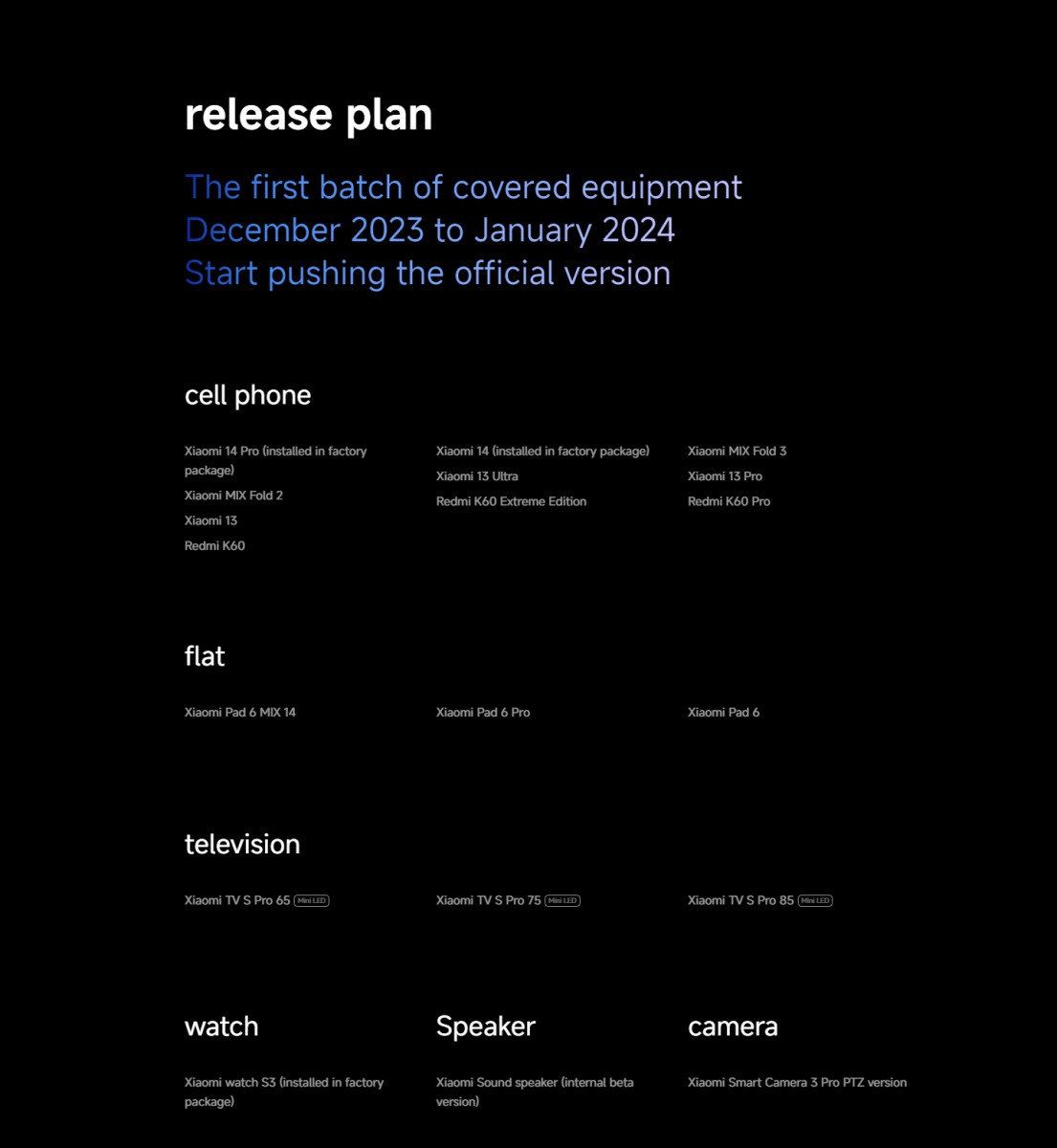 Tại màn giới thiệu, Xiaomi thông báo rằng việc cập nhật chính thức với HyperOS sẽ triển khai từ tháng 12/2023 với các mẫu máy tại Trung Quốc, và mở rộng vào quý 1 năm 2024 cho các máy quốc tế. Hai thiết bị di động đầu tiên là Xiaomi 14 cùng Redmi K60 Extreme Edition và máy tính bảng Xiaomi Pad 6 Max sẽ là các sản phẩm đầu tiên sử dụng hệ điều hành mới.