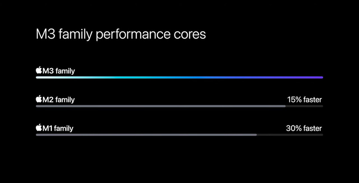Về CPU, Apple cũng so sánh Apple M3 series với Apple M1 series, nó sẽ có hiệu năng CPU cao hơn lên đến 50% (50% của nhân P-core và 30% của nhân E-core) so với Apple M1.