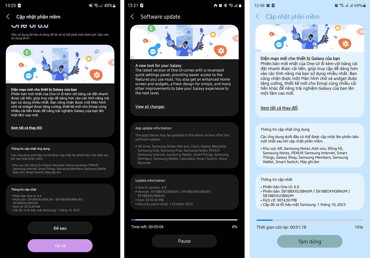 Hiện theo một số người dùng tại Việt Nam hiện đã có thể cập nhật lên OneUI 6.0. Nếu bạn đang sử dụng các thiết bị thuộc dòng Galaxy S23 series có thể thử cập nhật phần mềm mới bằng cách truy cập Cài đặt → Cập nhật phần mềm → Tải xuống và cài đặt. Nếu có phần mềm mới, bạn có thể chọn Cài đặt ngay, Lịch trình cài đặt hoặc Sau đó.