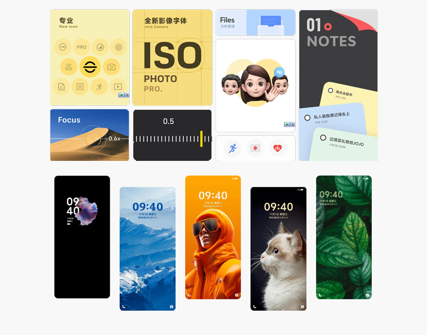 Các cải tiến về hiển thị bao gồm hơn 2000 icon được thiết kế lại và cải thiện hơn về mặt thị giác, cho phép người dùng thoải mái lựa chọn trong thư viện. vivo cũng đã mang phông chữ vivo Sans tùy chỉnh trên toàn bộ hệ thống, cùng tính năng UI Interactions tạo hiệu ứng làm mờ thời gian thực, hình nền theo ngữ cảnh và tùy chỉnh màn hình khóa.