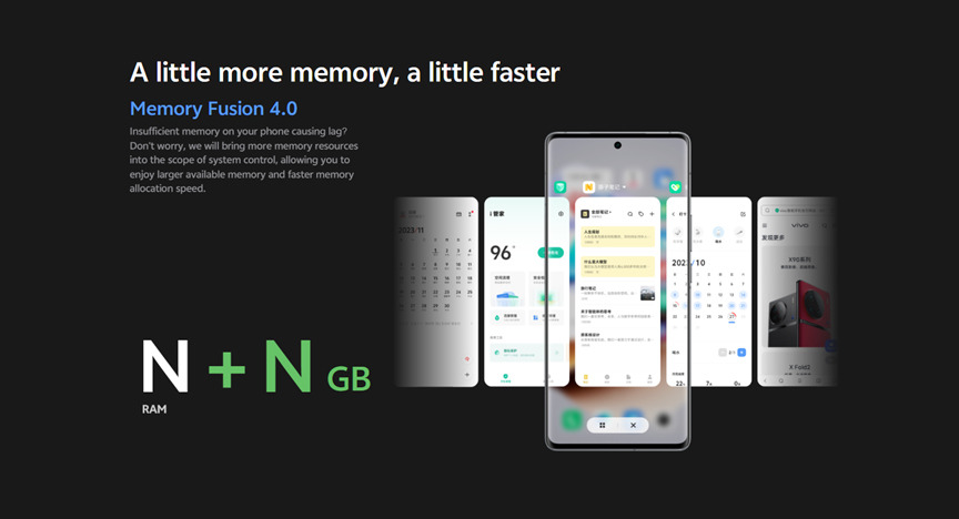 vivo cho biết, những cải tiến về hiệu suất bao gồm cải thiện tốc độ phản hồi ứng dụng nhanh hơn, được hỗ trợ bởi card đồ họa ảo (virtual graphics card) giúp giảm 36% thời gian mở và đóng ứng dụng, tăng độ ổn định tốc độ khung hình lên 70%.