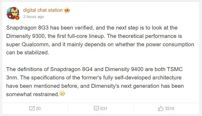 Trước khi nhắc tới Snapdragon 8 Gen 4 và Dimensity 9400 của năm tới, trong bài đăng trên Weibo tài khoản leaker Digital Chat Station đã nói về chipset mới được công bố Snapdragon 8 Gen 3 của Qualcomm cùng Dimension 9300 sắp ra mắt của MediaTek. Năm nay, Qualcomm và MediaTek đã lựa chọn quy trình N4P của TSMC thay vì chọn nút N3B 3nm tương tự Apple do các vấn đề về chi phí của tấm wafers, nhưng đổi lại công nghệ N3E của TSMC được cho là mang lại hiệu suất tốt hơn đáng kể.
