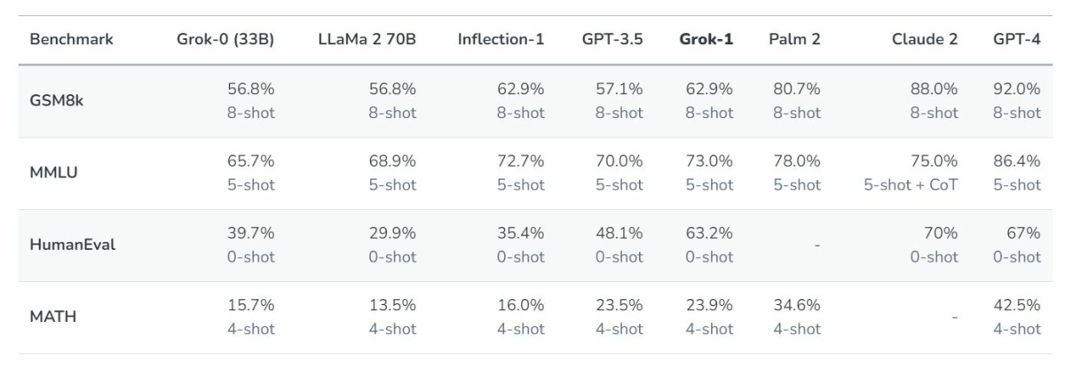 Grok vượt trội hơn tất cả các mô hình khác trong lớp điện toán của nó, bao gồm ChatGPT-3.5 và Inflection-1. Nó chỉ bị vượt qua bởi GPT-4, mô hình được đào tạo với lượng dữ liệu đào tạo và tài nguyên tính toán lớn hơn đáng kể.