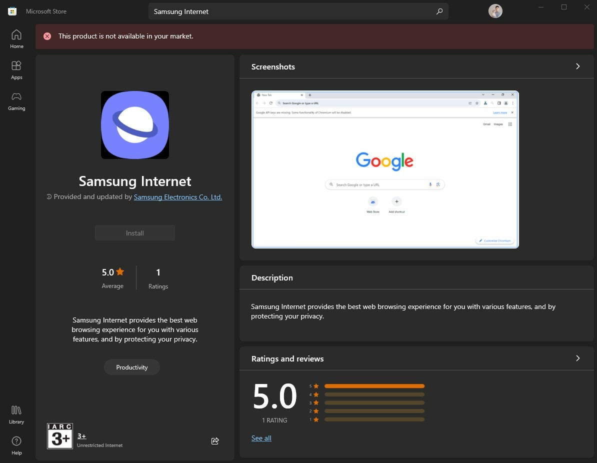 Samsung Internet hiện đã xuất hiện trên cửa hàng trực tuyến Microsoft Store và có thể tải xuống miễn phí. Trình duyệt hoạt động trên cả Windows 10 và Windows 11. Samsung không đưa ra thông báo chính thức nào về việc ra mắt phiên bản PC cho trình duyệt của mình. Và thông tin về Samsung Internet trên Microsoft Store cũng khá đơn giản, chỉ bao gồm một đoạn mô tả ngắn và ảnh chụp màn hình.