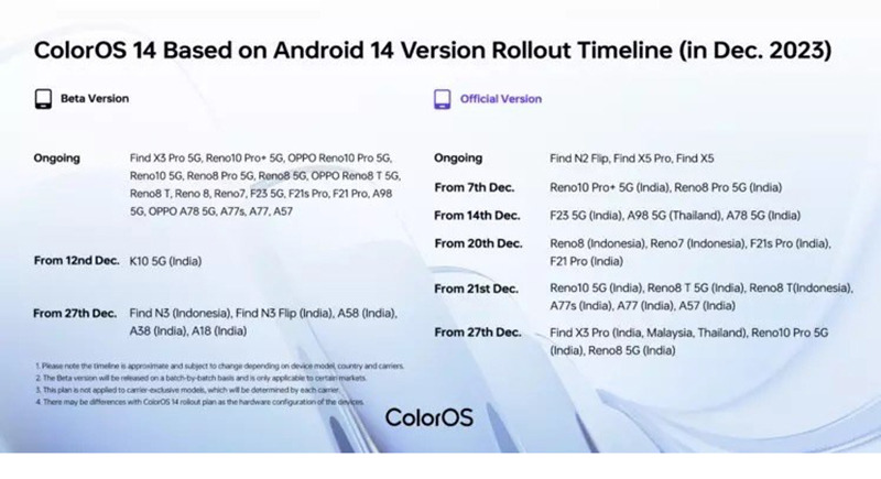 Theo lịch trình mới được công bố, trong tháng 12 này các thiết bị như Oppo F23 5G (Ấn Độ), Oppo A98 5G (Thái Lan) & Oppo A78 5G (Ấn Độ) dự kiến nhận được bản cập nhật trong tuần này. Lịch trình triển khai chính thức cho những tháng tới như sau: