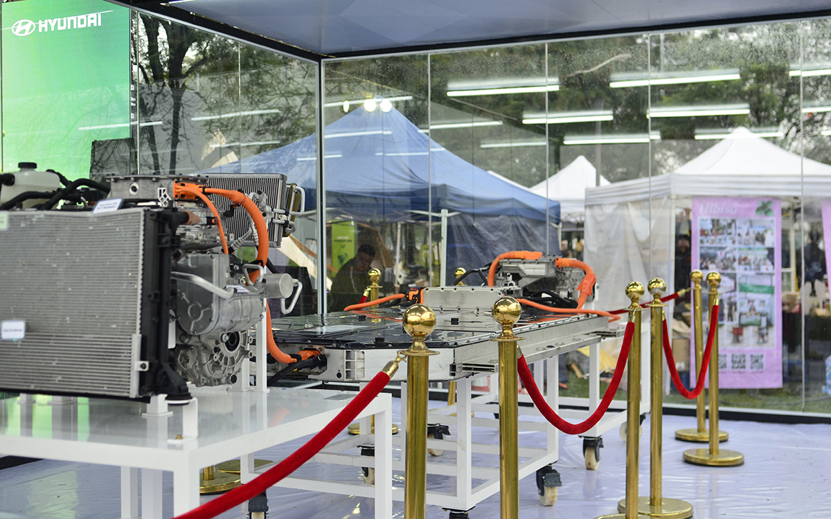 Ngay cổng vào sự kiện, công chúng có cơ hội tận mắt ngắm nhìn cấu trúc một phần nền tảng E-GMP đến từ Hyundai Motor, với pack pin lớn đặt chính giữa và động cơ kép trước, sau cho tổng công suất 230 kW.