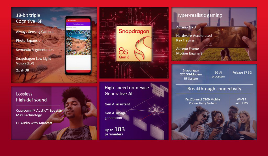 Chipset mới hỗ trợ tối đa 24GB RAM LPDDR5x (tối đa 4.200 MHz) và bộ lưu trữ UFS 4.0. Về kết nối, Snapdragon 8s Gen 3 sử dụng USB 3.1 Gen 2 qua USB-C. Dưới đây là bảng so sánh với Snapdragon 8 Gen 3 và Snapdragon 8 Gen 2 cũ hơn: