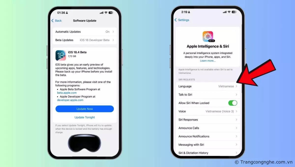 Một trong những điểm đáng chú ý của bản cập nhật này là Siri đã hỗ trợ tiếng Việt, tuy nhiên tính năng này hiện chưa khả dụng hoàn toàn. Apple dự kiến sẽ cải thiện Siri trong các bản beta tiếp theo, với khả năng hiểu ngữ cảnh tốt hơn và hỗ trợ thêm nhiều ngôn ngữ mới.
