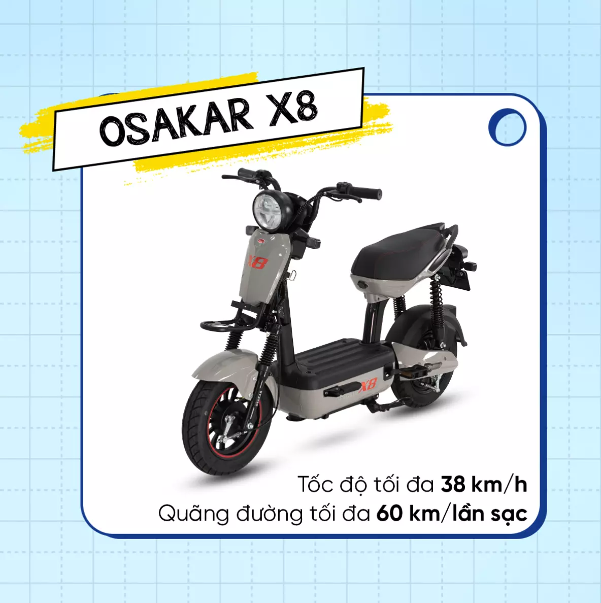 OSAKAR X8 là mẫu xe điện mang phong cách thể thao, năng động phù hợp với cả nam sinh và nữ sinh. Phương tiện sở hữu đèn pha tròn cổ điển, cùng bàn đạp linh hoạt hỗ trợ các tình huống hết điện giữa chừng.