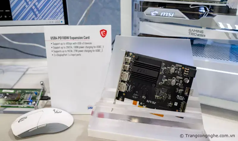 Dòng card mở rộng mới của MSI hiện tại không có kế hoạch bán ra riêng lẻ, mà sẽ được tặng kèm trong một số dòng mainboard cụ thể. Đây là một dòng card mở rộng hỗ trợ chuẩn USB4, cho phép truyền tải dữ liệu với tốc độ lên đến 40Gbps. Ngoài ra, nó cũng hỗ trợ Power Delivery lên đến 100W và đi kèm với 2 cổng DisplayPort 1.4.