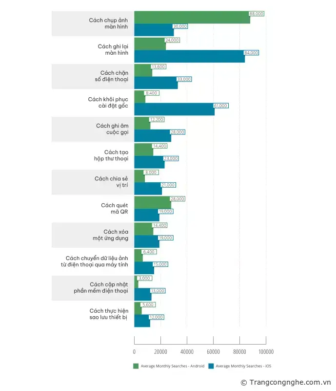 Tổng cộng, người dùng iOS thực hiện 358.000 lượt tìm kiếm trên Google mỗi tháng để được trợ giúp và sử dụng điện thoại của họ, trong khi người dùng Android thực hiện 226.000 lượt tìm kiếm.