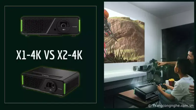 Như tên gọi, máy chiếu LED X1-4K sẽ phù hợp lắp đặt trên trần nhà với tỷ lệ phóng tiêu chuẩn. Máy chiếu gần X2-4K sẽ phù hợp đặt ngay trên kệ tivi để chiếu màn hình rộng 100 inch với khoảng cách từ 1,5m.