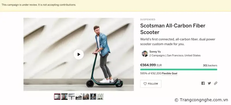 Chiến dịch gọi vốn cho mẫu xe scooter in 3D bằng vật liệu carbon của ông Sonny Vũ, đang bị tạm khóa để xác minh các cáo buộc từ người dùng.