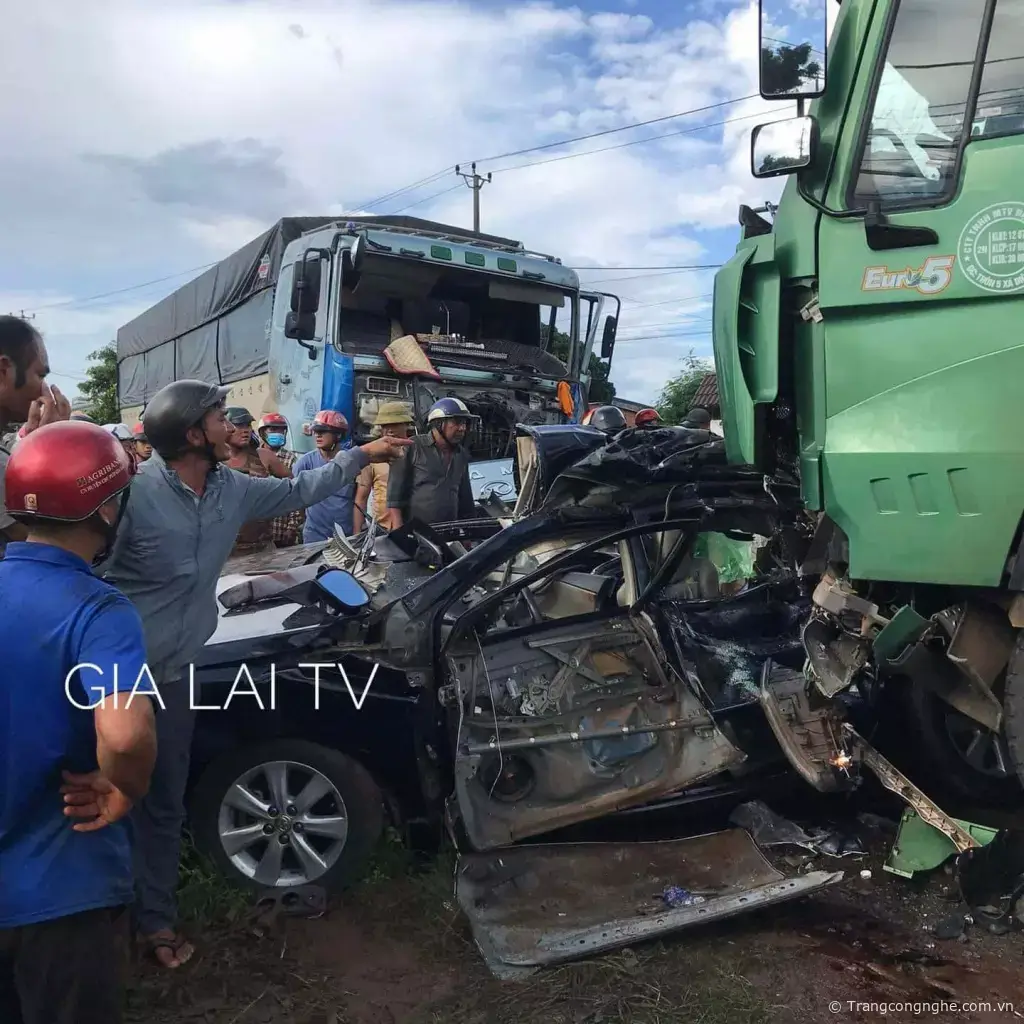 Tại hiện trường, ôtô 5 chỗ bị kẹp giữa hai xe tải, biến dạng. 4 người trên ôtô con bị mắc kẹt, tài xế xe tải phải cho xe lùi ra, cùng người dân phá cửa đưa các nạn nhân ra ngoài.