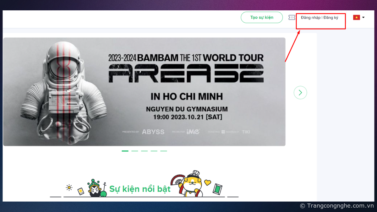 Bước 1: Truy cập website Ticketbox.vn, chọn Đăng nhập hoặc Đăng ký (Log in/Sign up)