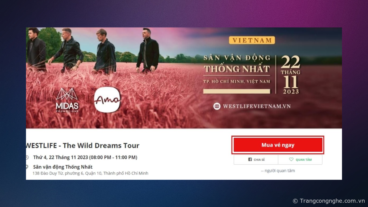 Nhóm nhạc đình đám một thời Westlife đã khiến khán giả Việt Nam cực kỳ phấn khích bởi concert vào ngày 22/11 sắp tới tại Thành phố Hồ Chí Minh. Nếu là một fan cứng, bạn nhất định không thể bỏ qua lần gặp gỡ nhóm nhạc huyền thoại này. Trong bài viết dưới đây, Trang Công Nghệ sẽ gửi tới bạn những thông tin về giá vé đêm concert cũng như cách đặt mua chính thức.