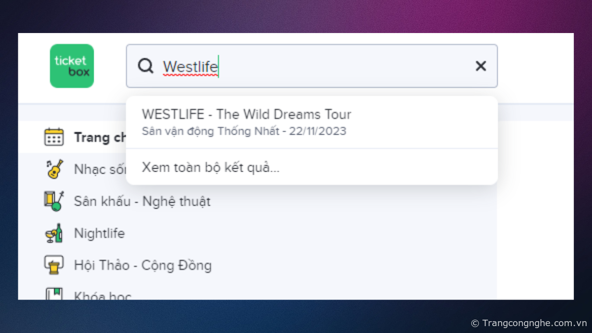 Bước 2: Tại ô tìm kiếm, nhập tên nhóm nhạc Westlife hoặc ấn vào bannẻ sự kiện tại trang chủ.