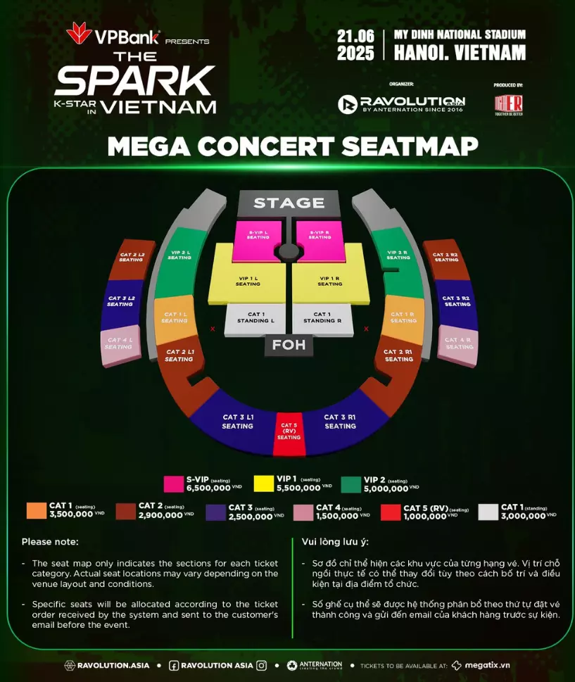 - Hạng vé CAT 5 (RV): Đây là hạng vé có mức giá thấp nhất, chỉ 1 triệu đồng/người, với vị trí xa sân khấu nhất.