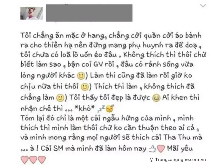 Lập tức dư luận chia thành 2 luồng ý kiến: Một bên bênh vực T.Đ rằng cậu có quyền làm những gì mình muốn. Bên còn lại nói rằng hành vi của T.Đ là phô dâm nơi công cộng, thực sự rất phản cảm. Còn T.Đ, cậu nhanh chóng đăng status trên Facebook giải thích cho màn biểu diễn của mình rằng “mình thích thì mình làm thôi”