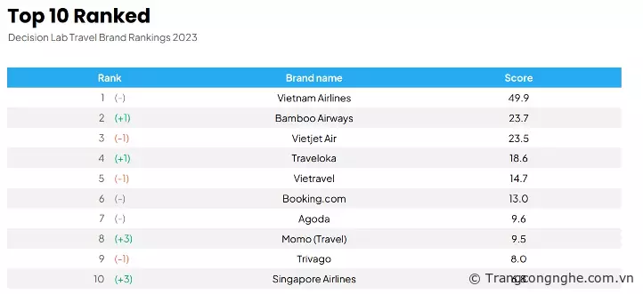 Đây là lần đầu tiên Decision Lab công bố Bảng xếp hạng thương hiệu du lịch năm 2023. Bảng xếp hạng được thực hiện trong khoảng thời gian từ ngày 24.5.2022 đến 23.5.2023, so sánh với cùng kỳ năm trước đó. Các thương hiệu được xếp hạng dựa trên chỉ số "cân nhắc tích cực" (positive consideration). Thông qua chỉ số này, người tham gia khảo sát được hỏi: "Trong lần tới khi mua các sản phẩm du lịch hoặc vé máy bay, bạn sẽ cân nhắc đến thương hiệu nào?".