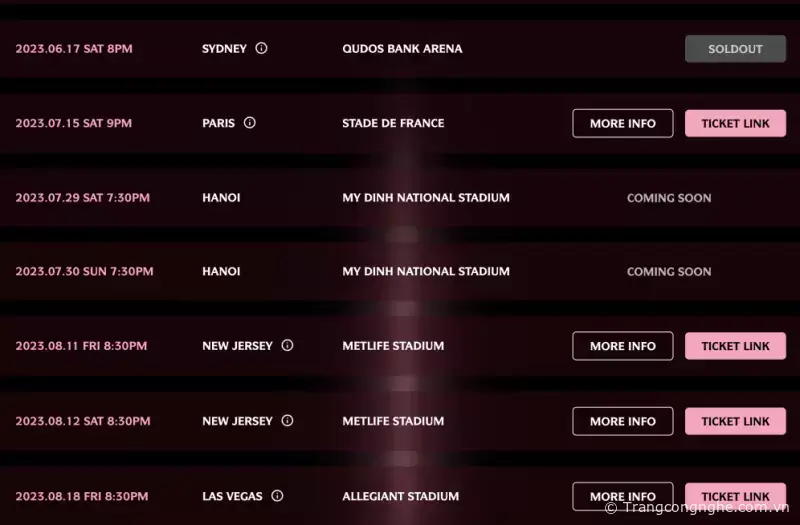 Gần ngày 7/7, người hâm mộ BLACKPINK sẽ có thể truy cập vào trang web https://blackpinkofficial.com/worldtourbornpink/ để mua vé cho concert thông qua liên kết "ticket link". Ngoài ra, trang web cũng cung cấp thông tin chi tiết hơn về các quy trình tham gia qua mục "more info".