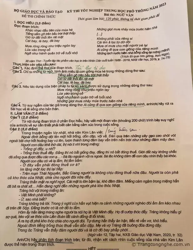 (Dân trí) - Câu hỏi 5 điểm của đề thi ngữ văn tốt nghiệp THPT năm nay ra vào tác phẩm "Vợ nhặt" của nhà văn Kim Lân. Hình ảnh đề thi được đưa ra sau 9h.