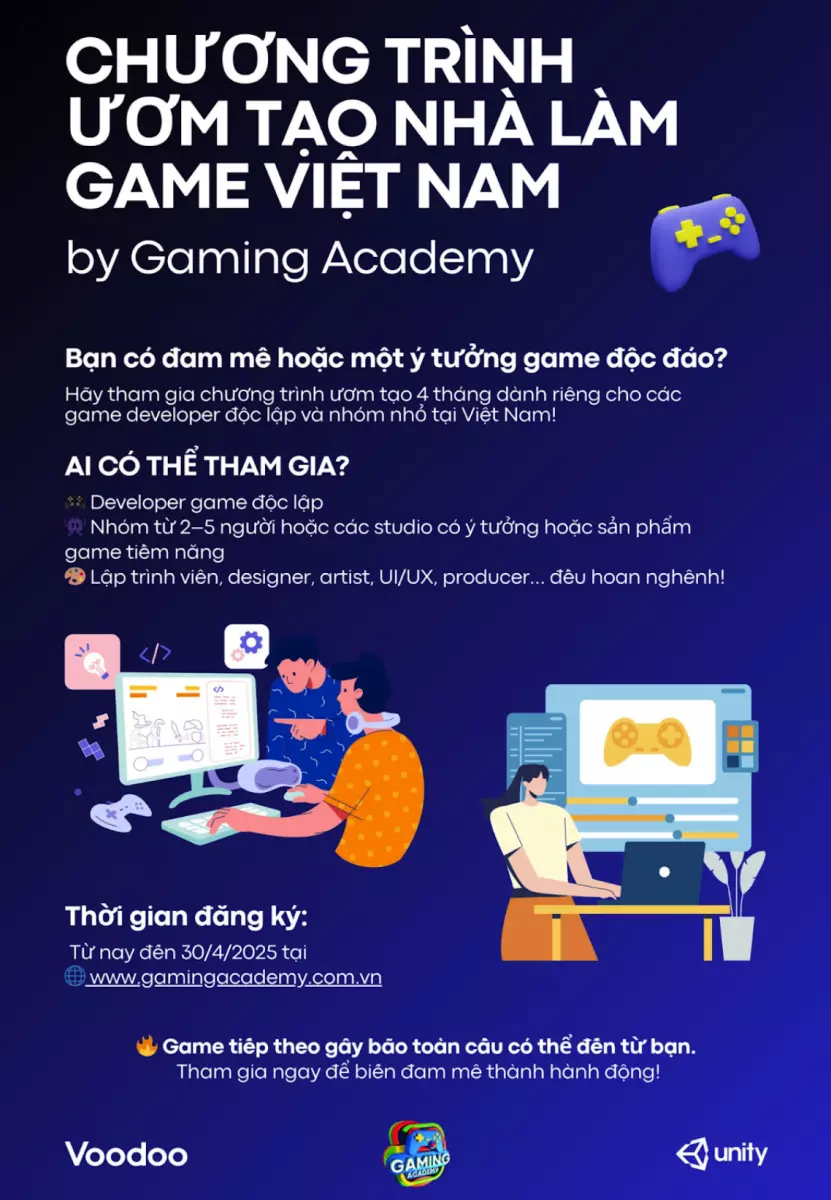 Gaming Academy chính thức triển khai chương trình ươm tạo game tại Việt Nam, hợp tác cùng Unity và Voodoo, mở ra một trang mới cho ngành game Việt. Chương trình ươm tạo game quốc tế này không chỉ là một cơ hội học tập và phát triển, mà còn là một lời khẳng định về tiềm năng và khát vọng vươn lên của ngành game Việt Nam trên trường quốc tế.