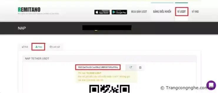 Bước 1: Đầu tiên bạn truy cập vào Remitano để lấy ví USDT, chọn ví USDT trên menu => chọn “Nạp” => phía dưới bạn sẽ thấy địa chỉ ví USDT trên Remi của bạn.