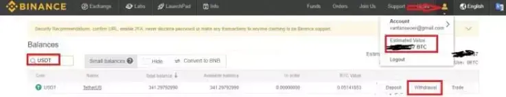 Bước 2: Vào sàn Binance => chọn tài khoản và chọn số dư (Estimated value) => nhập USDT vào ô tìm kiếm rồi chọn “Withdrawal“.
