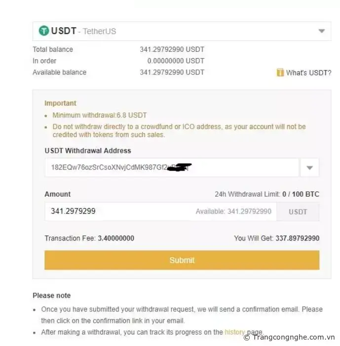Bước 3: Tại đây bạn sẽ nhập vào các thông tin rút USDT như sau: