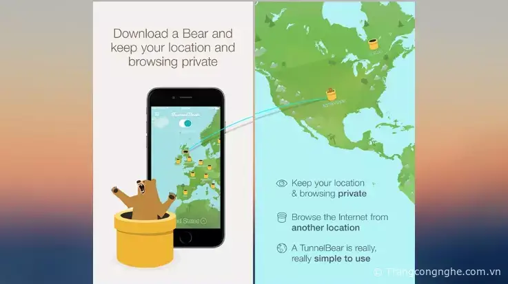 TunnelBear VPN là một phần mềm VPN dành cho các thiết bị chạy trên nền tảng iOS, bao gồm cả iPhone, iPad và iPod Touch. Giống như tên gọi của mình, phần mềm này sẽ thiết lập một đường kết nối mạng an toàn, giống như một đường hầm của chú gấu, cho phép người dùng có thể lướt web thoải mái mà không sợ để lộ danh tính của mình. Tuy nhiên, có một điểm bạn cần lưu ý khi sử dụng TunnelBear VPN là bản miễn phí chỉ giới hạn 500MB/tháng dung lượng, nếu cần nhiều hơn bạn cón thể mua gói Premium tùy theo nhu cầu sử dụng.