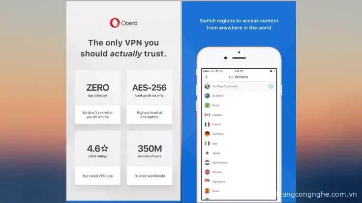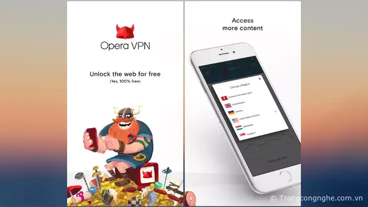 Opera hiện đã cung cấp ứng dụng VPN miễn phí và không giới hạn giúp bạn có thể truy cập web an toàn, vượt tường lửa tại các quốc gia hạn chế Internet,... Theo đó, khi chạy ứng dụng chúng ta sẽ được phép chọn vùng và chuyển VPN sang quốc gia đó tùy ý. Hiện tại Opera VPN hỗ trợ các nước như Hoa Kỳ, Canada, Đức, Singapore và Hà Lan. Bạn cũng có thể sử dụng ứng dụng này để chặn quảng cáo trên trình duyệt web, lưu ý Opera VPN là ứng dụng độc lập không cần phải cài đặt trình duyệt Opera thì bạn mới có thể sử dụng.