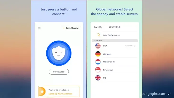 Cũng giống như Opera VPN, ứng dụng cho phép bạn truy cập vào các trang web nhanh hơn, sử dụng wifi một cách an toàn hơn. Bạn có thể truy cập ẩn danh mà không bị theo dõi như các trình duyệt ẩn danh thông thường. Tuy nhiên, VPN Master chỉ cung cấp cho bạn 7 vị trí truy cập ở bản miễn phí.