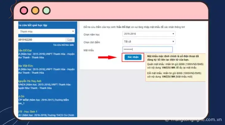 Bước 4: Để xem điểm của con mình, bạn cần nhập mật khẩu vào ô tương ứng trên màn hình (thường được mặc định là SĐT mà phụ huynh đăng ký) và sau đó chọn xác nhận.