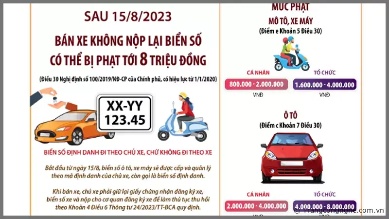 Theo thông tư 24/2023, trong trường hợp chủ phương tiện không thực hiện việc nộp lại biển số và đăng ký xe trong 30 ngày kể từ khi làm giấy tờ bán xe, sẽ bị áp dụng các biện pháp xử phạt hành chính với mức phạt tối đa lên đến 8 triệu đồng. Điều này được cụ thể hóa tại Điều 30 của Nghị định 100, quy định việc không tuân thủ thủ tục thu hồi đăng ký và biển số xe mô tô, xe máy và các loại xe tương tự sẽ chịu mức phạt từ 400 đến 600 nghìn đồng đối với cá nhân, và từ 800 đến 1,2 triệu đồng đối với tổ chức là chủ sở hữu của các loại xe nói trên.