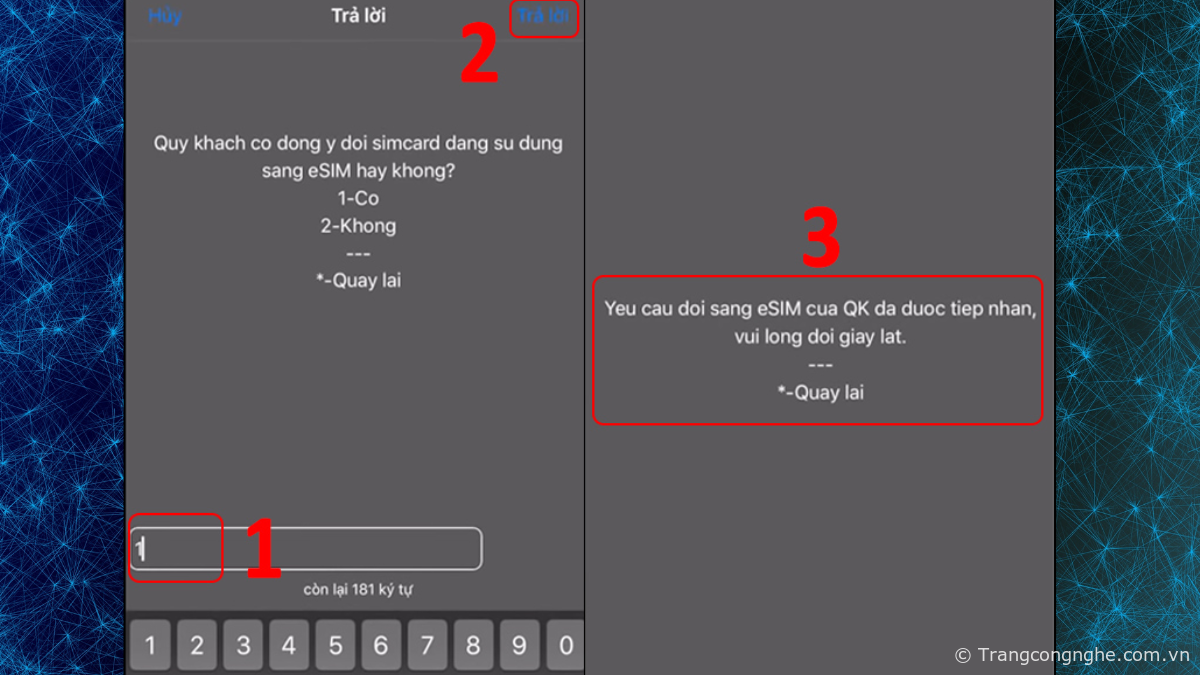 Bước 2: Nhập tiếp "1" rồi nhấn Trả lời. Thông báo “Yêu cầu đổi sang eSIM đã được tiếp nhận” sẽ xuất hiện.