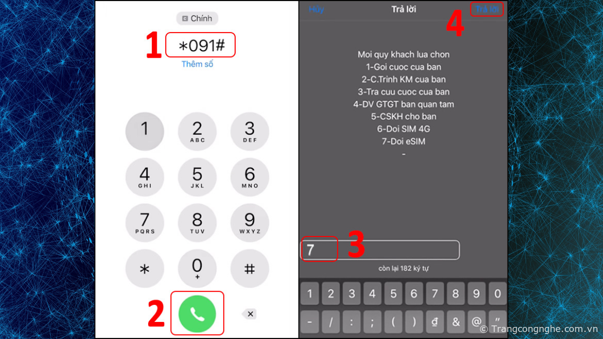 Bước 1: Bấm gọi *091# nhập số "7" để Trả lời.