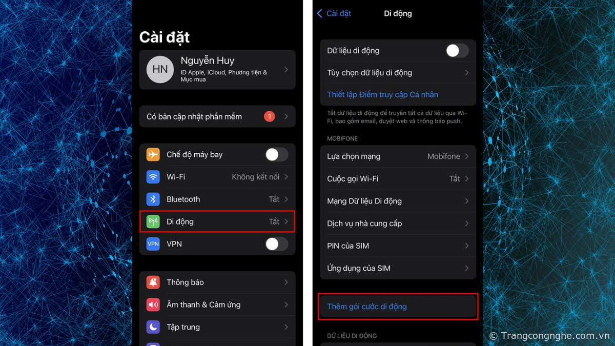 Bước 3: Ấn vào Thêm gói cước di động. Tiếp theo chọn Nhãn gói cước di động và nhấn Tiếp tục. Sau đó tắt nguồn và khởi động lại thiết bị để cập nhật eSIM.
