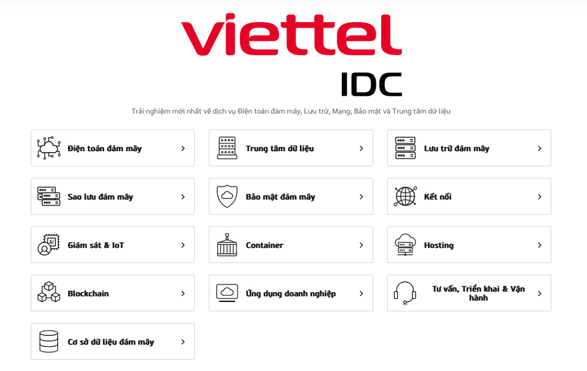 Viettel IDC cung cấp nhiều dòng sản phẩm như Cloud Server, Storage On-demand giúp khách hàng tối ưu chi phí. Bên cạnh đó là các dịch vụ PaaS, IaaS có khả năng mở rộng linh hoạt theo nhu cầu. Giá cả cạnh tranh cùng nhiều ưu đãi khi đăng ký dài hạn.