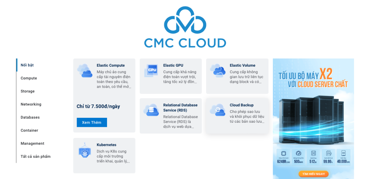 CMC Cloud đem lại nhiều lựa chọn sản phẩm như Cloud Server, Storage, CDN, DR... với giá thành cạnh tranh. Đội ngũ kỹ thuật giàu kinh nghiệm và luôn sẵn sàng hỗ trợ khách hàng 24/7. Chính sách bảo mật, an ninh thông tin nghiêm ngặt tuân thủ quy định.